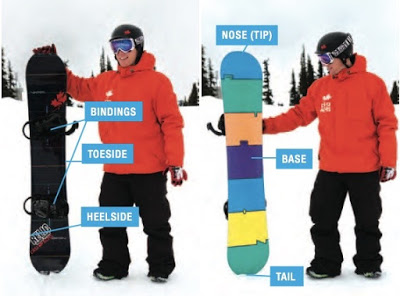 from CASI reference guide 1.雪板的板頭跟板尾 (Nose & Tail) 作用:引領前進的方向,微微的翹起減低前行時與雪地的摩擦。 2.雪板的鋼邊 (edge) 作用:雪板兩側的金屬條,可以有效地劃過雪地產生阻力,進而控制滑行的方向與速度。 鋼邊分為toe side以及heel side。腳站在雪板時,腳指頭那邊的鋼邊為toe-side edge,腳踝那邊為heel-side edge。 3.雪板板底 (base) 作用:滑行在雪地上的部分。 4.固定器(binding) 作用:連接雪板與雪鞋, 將雙腳固定在雪板上。 固定器,有幾個重要的部分 a.綁帶 (strap):分為腳趾綁帶(toe strap)與腳踝綁帶(ankle strap)。 b.支撐片(highback):支撐在小腿後方。前進腳的判定