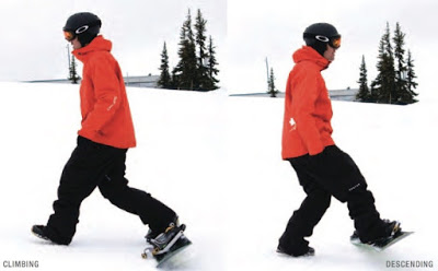 1.面向上坡 2.將雪板打橫(與下降線垂直),後腳放在板子前面 3.踮起前腳尖,讓腳跟離地,用toe side的鋼邊卡住雪地,用力向下壓,確定雪板不會滑動 4.後腳向前走一步 5.前腳抬起雪板,跟著向前一步,再將toe side鋼邊卡進雪地 6.重複步驟4&5向下攀登