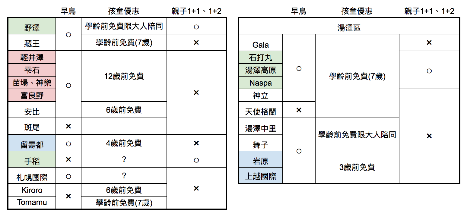 此文作者:James教練 近年來越來越多家長帶著小朋友到日本參加滑雪的活動,家庭滑雪需要注意的事比一般自助還多,這裡就一一跟大家分享需注意的事項。 一、如何挑雪場 一般來說大家都會選擇去日本滑雪,但日本有數百個雪場,第一次去滑雪要怎麼挑選雪場呢? 這裡跟大家分享如何挑選適合親子遊的雪場,適用於不同國家。 建議可以先找有以下條件的雪場,對於親子遊比較適合。 1.有早鳥票可以買(部份雪場小朋友雪票不用錢) 2.晴天率很高(在晴天滑雪比較舒服) 3.開車方便(若不想滑一整天還可以開車旅遊) 4.有遊樂設施(小朋友最愛) 5.初學者雪道,超緩斜面(適合全家一起學習滑雪) 6.附近有住宿、無料休息室,不用移動太遠(滑累了就休息) 7.有幼兒滑雪學校(若小朋友年紀太小可以考慮幼兒的滑雪學校) 8.有托兒所(若小朋友年紀太小可以托兒,自己去滑雪) 一般來說王子飯店系列的雪場(苗場、輕井澤、富良野)以及中里雪場都有ski in/out,對於初學者算是蠻方便的雪場,知名度高的例:二世谷、留壽都也算是方便的雪場。 或是參考日本網站,有整理適合親子遊的雪場 http://iko-yo.net/topics/ski![]()