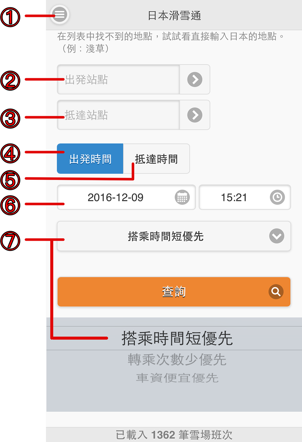在介紹如何使用app之前,先謝謝各位下載這個app,我們歷經超過一年時間的規劃,半年以上的製作及整合資訊,總算趕在16-17雪季前完成,讓大家能在出發前往雪場時,有這個便利的工具讓大家使用。 目前暫不提供iOS版本下載 Android版本下載 廢話不多說,這裡會詳細介紹如何使用此app。 首先打開app後,就會出現主要畫面如下:1.打開側邊欄,目前有ski轉乘案內功能,以及skidiy會員登入證明。 2.出發站點 可以在右側箭頭點選內建站點,或是在框內輸入文字。 因轉乘資料串接日本Yahoo!路線情報,所以可輸入漢字、日文、日文拼音查詢。 3.抵達站點 可以在右側箭頭點選內建站點,或是在框內輸入文字。 若想要查詢目的地離出發地很近或是有直達班次,建議先選擇「抵達站點」,再選擇「出發站點」,這時候最上方會有直達路線可供選擇。 4.出發時間 搜尋結果會以出發時間來排列,較適合短時間內要出發的人選擇使用。 5.抵達時間 搜尋結果會以抵達時間來排列,較適合長期規劃的人選擇使用。 6.日期選擇 由於此app內建大量冬季雪場直達或區間巴士,運行期間大多為12月中至隔年3月底,因此搜尋此外日期有可能查無結果。 7.搜尋方式選擇 預設選項為「搭乘時間短優先」,點選可切換「轉乘次數少優先」「車資便宜優先」,結果將會不同。 內建站點選項