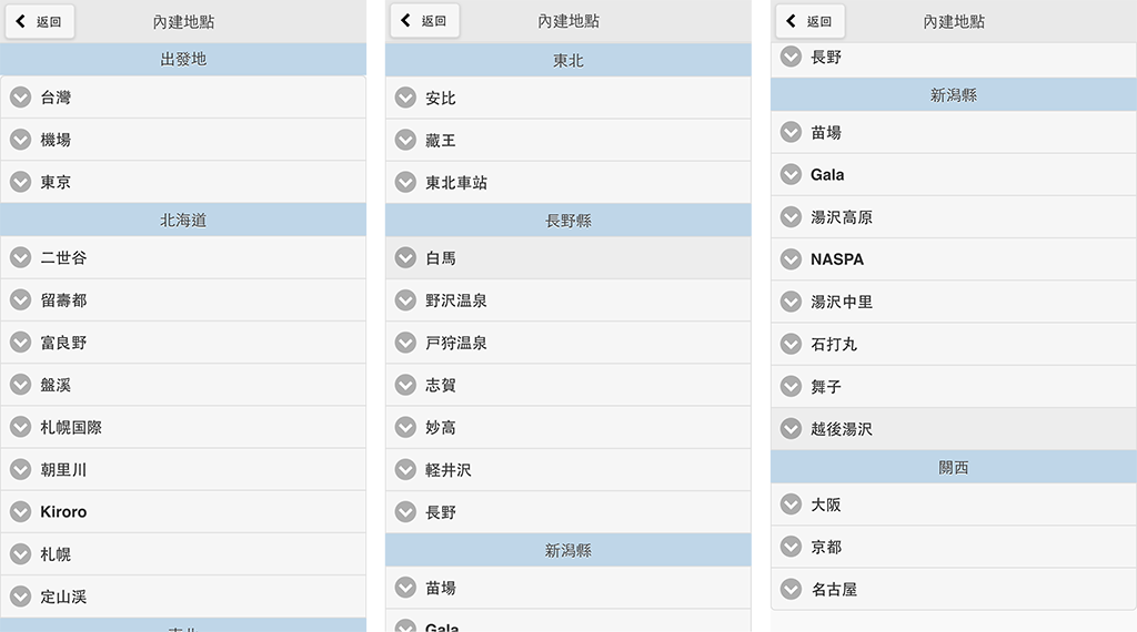 *NEW為17-18最新資料、未建表示尚未建入app中、未上架表示之前曾有這條路線,目前下架中 東京 成田空港→東京 ===新潟=== 苗場 (18-19更新)越後湯沢→苗場 王子飯店宿泊者専用 (18-19更新)越後湯沢→苗場 (18-19更新)品川→苗場→軽井沢 (18-19更新)越後湯沢→苗場(經三國大街) (網站未更新)越後湯沢→苗場 Gala (網站未更新)越後湯澤→Gala 湯澤中里 (18-19更新)越後湯沢→湯澤中里 石打丸 (18-19更新)越後湯沢→石打丸 舞子高原 (18-19更新)越後湯沢→舞子高原 ===長野=== 長野 東京→長野 長電巴士(未上架) 軽井沢 池袋、横浜・品川→軽井沢(未建) 新宿、池袋駅→軽井沢(未建) 横浜駅→軽井沢(未建) 渋谷駅→軽井沢(未建) (18-19更新)羽田空港→軽井沢/keikyu 羽田空港→軽井沢(西武)(未建) (18-19更新)軽井沢循環巴士 野澤 (18-19更新)成田空港→野澤 (18-19更新)羽田空港→野澤 (18-19更新)野澤→白馬、志賀、妙高、斑尾、東京、成田空港、羽田空港 (網站未更新)飯山→野澤 (18-19更新)野澤溫泉街巴士 (網站未更新)野澤→班尾(未建) 白馬 (18-19更新)成田空港→白馬/alpico (18-19更新)成田空港→白馬/naganosnowshuttle (18-19更新)羽田空港→白馬/alpico(未建) (18-19更新)羽田空港→白馬/naganosnowshuttle (網站未更新)新宿駅→白馬/alpico(未建) (未更新)長野→白馬(未建) (未更新)白馬村巴士 (18-19更新)白馬→妙高、志賀、野澤、東京、成田空港、羽田空港 志賀 (18-19更新)成田空港→志賀 (18-19更新)羽田空港→志賀 (18-19更新)志賀→妙高、白馬、野澤、東京、成田空港、羽田空港 妙高 (18-19更新)成田空港→妙高 (18-19更新)羽田空港→妙高 (18-19更新)妙高→白馬、志賀、野澤、東京、成田空港、羽田空港 (網站未更新)東京→妙高(夜巴)/travex(未建) (NEW)東京→妙高(夜巴)/skiski(未建) (NEW)名古屋→赤倉溫泉(夜巴)/skiski(未建) (NEW)關西→赤倉溫泉(夜巴)/skiski(未建) (NEW)成田空港、羽田空港、新潟空港、富山空港→妙高(未建) (NEW)妙高區巴士(未建) 斑尾高原 (網站未更新)東京→斑尾高原/travex(未建) (網站未更新)東京→斑尾高原(夜巴)/travex(未建) (NEW)東京→斑尾高原/skiski(未建) (NEW)東京→斑尾高原(夜巴)/skiski(未建) (NEW)關西→斑尾高原(夜巴)/skiski(未建) (NEW)名古屋→斑尾高原(夜巴)/skiski(未建) Mt.乗鞍 (NEW)關西→Mt.乗鞍(夜巴)/skiski(未建) ===東北=== 藏王 (NEW)山形駅、仙台駅、仙台空港→藏王 (NEW)東京→山形 安比 (18-19更新)仙台駅、花卷空港、青森空港、仙台空港→安比 猪苗代 (網站未更新)東京→猪苗代/travex(未建) (網站未更新)東京→猪苗代(夜巴)/travex(未建) (NEW)東京→猪苗代/skiski(未建) (NEW)東京→猪苗代、磐梯(夜巴)/skiski(未建) 磐梯 (NEW)東京→磐梯/skiski(未建) ===北海道=== 札幌 (NEW)新千歲空港⇔札幌(未更新) 盤溪 (NEW)札幌⇔盤溪 札幌國際 (NEW)札幌⇔札幌國際 (NEW)新千歲空港⇔札幌國際 キロロ (NEW)札幌⇔キロロ (NEW)新千歲空港⇔キロロ 二世谷 (NEW)新千歲空港⇔二世谷/goodsports (NEW)新千歲空港⇔二世谷/access-n (NEW)新千歲空港⇔二世谷/NGS(未建) (NEW)新千歲空港⇔二世谷/chuo(未建) (NEW)札幌⇔二世谷 (NEW)富良野⇔二世谷(未建) (NEW)星野⇔二世谷(未建) (NEW)二世谷區間巴士(未建) 富良野 (NEW)旭川空港⇔富良野 (NEW)旭川空港⇔富良野/access-n (NEW)新千歲空港⇔富良野 (NEW)札幌⇔富良野/access-n (NEW)札幌⇔富良野/chuo (NEW)富良野市區巴士 (NEW)二世谷⇔富良野(未建) (NEW)留壽都⇔富良野(未建) (NEW)星野⇔富良野(未建) 留壽都 (NEW)札幌⇔留壽都 (NEW)札幌⇔留壽都/access-n (NEW)新千歲空港⇔留壽都 (NEW)新千歲空港⇔留壽都/access-n (NEW)富良野⇔留壽都(未建) (NEW)星野⇔留壽都(未建) (NEW)二世谷⇔留壽都(未建) 星野 (NEW)新千歲空港⇔星野(未建) (NEW)旭川空港⇔星野(未建) (NEW)富良野⇔星野(未建) (NEW)二世谷、留壽都⇔星野(未建) >>閱讀更多滑雪相關文章