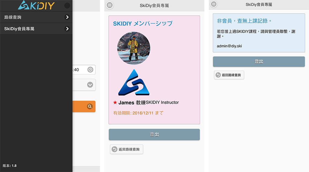 最左邊的畫面為側邊欄,目前有功能有交通查詢、會員登錄,新功能陸續開發中。 中間畫面為會員登入顯示,教練們也同樣會顯示身份。 若你曾經上過skidiy的課程,登入後出現最右邊的畫面,請主動跟我們連繫,我們將會你調整。 查詢範例