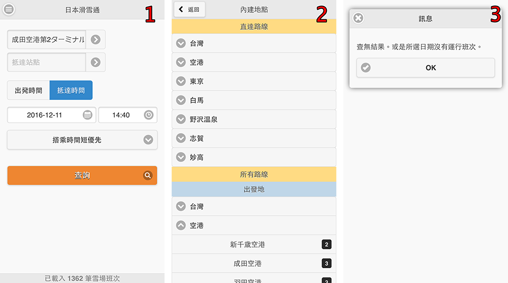 1.選擇站點後,裡面出現日文是正常的,由於日本Yahoo!路線情報串接資料需要日文,因此站點會以日文呈現。 2.選擇出發或抵達站點其中一個後,再選擇另一個時,最上方就會出現圖示的「直達路線」選項,若在其中有你想要的選項,直接選擇後會是最快的搜尋方式。 3.若選擇的日期、時間沒有班次,將會出現此畫面,請更換日期時間再試試。 其他畫面