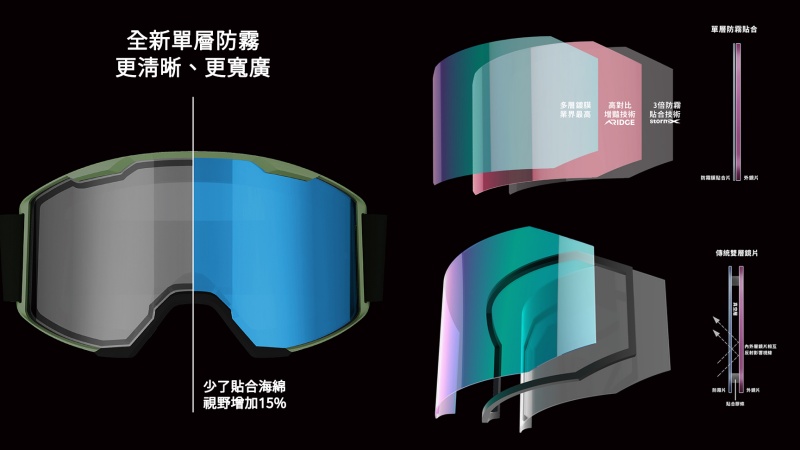 所謂視野安全性,不外乎強調雪鏡的防霧透氣性及清晰的視野。 VIGHT獨家單層防霧科技,突破傳統雙層鏡片的概念,將內層防霧片變成薄膜形式,透過奈米貼合強化於PC前鏡片,除了減少雪場上兩層鏡片中間起霧時,無法當下清除的問題,更解決了因貼合關係使視野縮小的狀況。 你將有更清晰、更寬廣的視覺享受。採用單層防霧的DEFENDER系列更具備輕量化,配戴上沒有重量壓迫感。 在雪場你必須以安全為第一,而DEFENDER可以讓你享有安全滑雪視野的同時,又能稱霸雪場第一帥☺5.不能忽視的防霧技術
