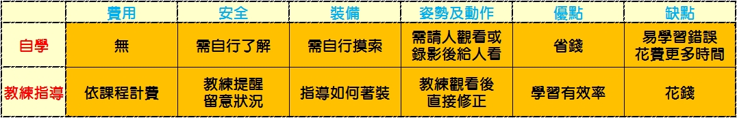 簡單的將這兩種方式的好壞用表格分析這樣大家應該可以了解自學滑雪和教練指導的差別及優缺點囉,看起來自學最大的優點就是省錢@@ 所以建議若是第一次滑雪就去國外,一般來說都是滑個2到3天,盡量不要省這筆教練費,不然可能到回國都還沒學會; 若是預算的考量,那也想辦法在台灣先將第1、2階段學會,後面2個階段再請教練指導,4個階段都學會才能真正的叫滑雪喔。 >>閱讀更多滑雪相關文章