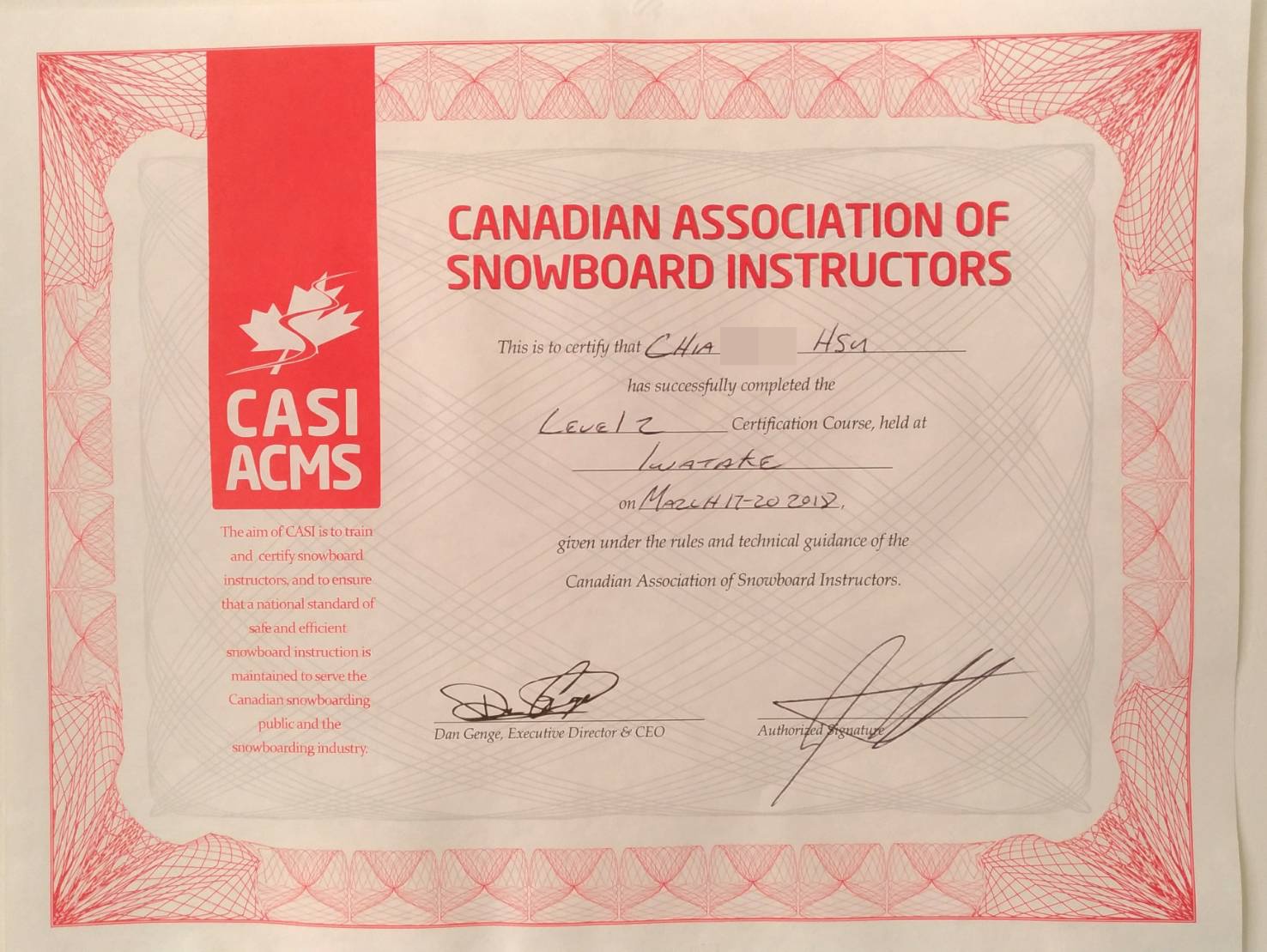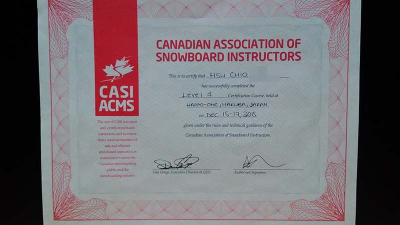 2012 苗場 Ski (3天) 2013 安比 SB (3天) 2014 白馬 SB (6天) 苗場 SB (6天) 留壽都 SB (6天) 2015 苗場 SB (6天) 白馬 SB (14天) 2016 二世谷-苗場-白馬-神立-丸沼 SB (90天) 2017 輕井澤-苗場-野澤-GALA-志賀燒鵝山-白馬-舞子 SB (100天) 2018 輕井澤-GALA-白馬-野澤-苗場-湯澤中里-中里天使格蘭-神立-加拿大whistler (110天) *2015 12月通過加拿大滑雪指導員協會 CASI Level 1 教練執照 *2018 03月通過加拿大滑雪指導員協會 CASI Level 2 教練執照