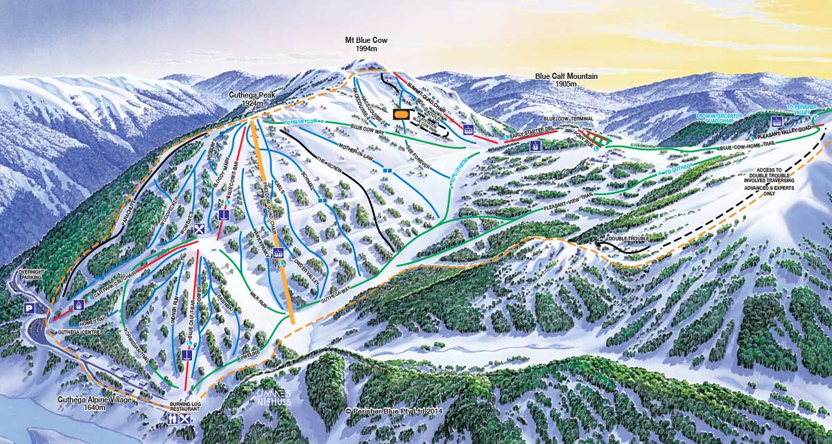 是四個雪山中最大的雪場,同時也是雪友集中的區域,擁有世界少見的八人纜車(日本Gondola除外),瑞雪雪山火車抵達第一站就是Perisher,精確一點說明是屬於front valley區,過了鐵橋就可以看到知名的八人纜車,右手邊則是Perisher休憩的餐廳,而餐廳正門口則有最大初學者滑雪道區,配合魔毯運輸雪友。 本區可以細分為四個區域,1.Front Valley : 最多人 有V8(簡稱八人覽車)。2.Center Valley : 有最長的4人纜車 (和 Front Valley 接在一起)。3.South Perisher : 最多人叫他 Mt. Perisher (簡稱 Mt.P) 超級困難。4.North Perisher : 連接 Perisher 到 Blue cow 雪場的地形。 ![]()