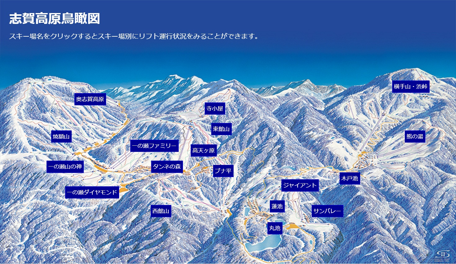志賀高原滑雪場(1998奧運主辦場地)是日本長野縣三大滑雪場之一,也號稱是全日本滑雪面積最大及地形最高的滑雪場,本身結合了19座滑雪場,30個滑雪區域,擁有52台纜車,是一個連滑雪高手去,看到雪道地圖都會先愣一下的大型雪場,同時因為1992舉辦奧運比賽而使之非常有名氣。 志賀高原的19座雪場如下列,而其中台灣最知名的是擁有ski in/out的燒額山滑雪場,山腳下就是有名的王子飯店系統的雪場。 1. 一の瀬ダイヤモンドスキー場 Ichinose Diamond Ski Area (1 2共通夜滑18:30~21:00 2100日幣) 2. 一の瀬ファミリースキー場 Ichinose Family Ski Area (1 2共通夜滑18:30~21:00 2100日幣) 3. 一の瀬山の神スキー場 Ichinose Yamanokami Ski Area 4. 奥志賀高原スキー場 Okushiga Ski Area 5. 木戸池スキー場 Kidoike Ski Area 6. 熊の湯スキー場 Kumanoyu Ski Area (夜滑18:30~21:00 1600日幣) 7. サンバレースキー場 Sunvalley Ski Area (夜滑19:00~21:00 1600日幣) 8. 渋峠スキー場 Shibutouge Ski Area 9. ジャイアントスキー場 Giant Ski Area 10.高天ヶ原マンモススキー場 Takamagahara Ski Area (夜滑18:30~21:00 1600日幣) 11.タンネの森オコジョスキー場 Tannenomori Okojo Ski Area 12.寺小屋スキー場 Terakoya Ski Area 13.西館山スキー場 Nishitateyama Ski Area 14.蓮池スキー場 Hasuike Ski Area 15.東館山スキー場 Higashitateyama Ski Area 16.発哺ブナ平スキー場 Hoppo Bunadaira Ski Area 17.丸池スキー場 Maruike Ski Area (夜滑19:00~21:00 1600日幣) 18.焼額山スキー場 Yakebutaiyama Ski Area (夜滑17:00~21:00 1600日幣) 19.横手山スキー場 Yokoteyama Ski Area志賀高原滑雪場分布鳥瞰圖 本區域還有另外一個特色就是,雪場相當大非常的好逛山,號稱從早到晚都可以滑在不同雪道,同一部纜車不會搭到第二次。也因為雪場雪道分布相當多,滑雪過程中幾乎很難遇到大量的雪友,想要享受自由自在滑雪又沒人干擾的滑雪場地,志賀高原非常值得一探究竟。 志賀高原和湯澤群山、白馬群山、妙高高原群山等雪場不一樣的是,志賀高原19座雪場可以使用同一張票全山跑,而且一次可以跑很多座滑雪場,雖然有些地點不好連接,但是雪場可以透過簡單的巴士接駁抵達 另外一個本區滑雪特色,基本上雪道多變、纜車數量、雪場連接性都不錯,缺點是連接道都比較平,甚至還要往上坡滑行,如果技術或是程度不夠,可能需要拆板走路,奧志賀及熊之湯2個雪場目前仍然是ski only對於SB的雪友較不友善。 雪場常見問題