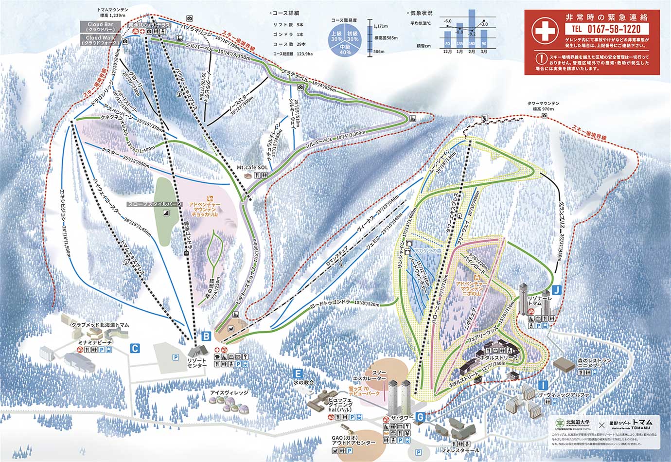 雪場分兩處,西山 ( Tomamu Mountain ) 高 1239 米、東山 ( Tower Mountain ) 970 米、四棟飯店都在東山處,西山相對較大也較高。共有 29 條雪道 5 台纜車與 1 台 Gondola。每天滑雪場纜車開放時間相對於其他滑雪場較短,白天時段只開到下午四點,夜滑也只開到晚上六點。 雪場面積 123.9 公頃,滑道總長 21.3 公里,基本上算是中型滑雪場,雪道分為初級 ( 綠線 ) 10 條、中高級 ( 藍線 ) 14 條、上級 ( 黑線 ) 4 條,另有 1 條初學者道,分級採歐美雪場習慣的綠藍黑三色。另外有開放雪道外滑雪區,需要申請攜帶臂章。