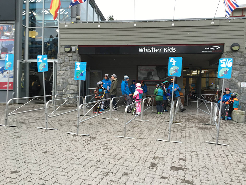 山底下兩個村子,一般我們說的惠斯勒村跟另一邊黑梳山村中間隔著一條小溪,有好幾座橋可以通行走過去大概10分鐘,所以就算住在不同區域走路也不會走太遠。兩座山的上面有大型20人座纜車相連,叫做 peak to peak,滑雪票可以無限次搭乘,但是要注意下班時間或是颳風停駛。 惠斯勒綠線比黑梳山多,但是這裡的綠線也有蠻多偏陡的滑道,所以初學或是程度還沒很熟悉的雪友,記得還是要練習好或是建議有要教練,或是有經驗的領滑者。 惠斯勒base有兩個廂型纜車站;右邊大的是往惠斯勒山,第一站是「初學區」只有買課程的初學者下車;其他人都要直接搭到山頂,惠斯勒纜車山頂站就是奧運五環標誌的地方,叫做 Roundlehouse ,也就是CSIA LV1 考試報到的地方(ps. CSIA LV2 集合地點一般是在山下base附近)Roundlehouse 旁邊有一個大的建築物有紅色的大